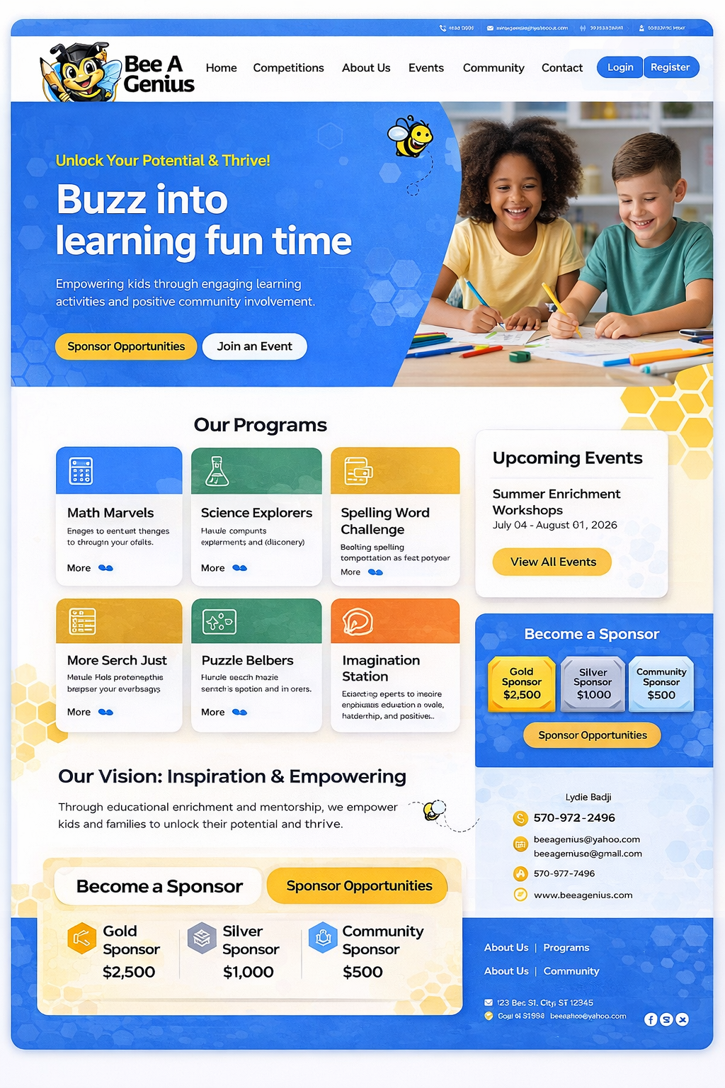 Bee A Genius is a high-energy dedicated to inspiring students from 1st through 10th grade existing educational competitions that blend learning with fun .our programs spark curiosity and confidence by engaging students in Math,Science,Spelling word ,Art , words search, Puzzle,Lego building/ Challenge bricks. Buzz into learning fun time Hula hoop, free throws, dance freeze Education that sparks Brilliance where little mind becomes Genius. Inspiration & Empowering. Bee A Genius exists to inspire curiosity cultivate creativity and empower individuals to discover the genius within themselves through innovative learning and meaningful growth experiences . Education-Focused. Bee A Genius is committed to providing engaging accessible and transformative educational experiences that help learner build confidence critical thinking skills , and a lifelong love for learning. Youth Development Focus. Bee A Genius empower young minds to think boldly learn joyfully and grow confidently by nurturing creativity leadership and academic excellence. Short & Memorable . Bee A Genius helps every learner unlock their potential and thrive with confidence creativity and purpose. Community. Bee A Genius is more than just competition it’s a full day celebration of creativity intelligence and community along opportunity to participate in additional including.